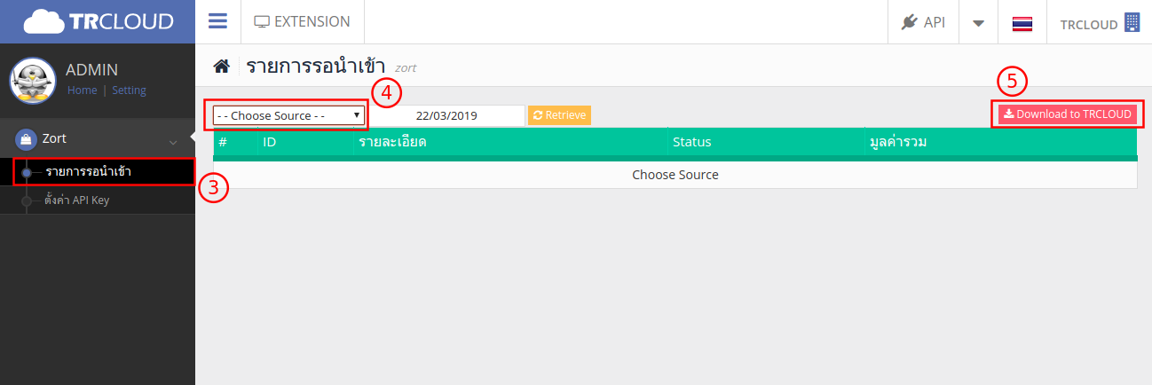 5.หากต้องการทำการนำเข้ารายการเข้าสู่ TRCLOUD ให้กด Download to TRCLOUD ตามหมายเลขที่ 5
